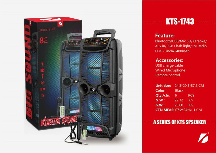 اولین و بزرگترین مرجع فروش اسپیکر های قابل حمل در ایران اسپیکر دبل ساب 8 برند معتبر مدل kts1743 *آکبند و پلم* کیفیت فوق العاده سایز دبل 8 اینچ پاسخگویی فرکانس 20 تا 20000 هرتز حساسیت 90 دسی بل نوع باتری لیتیوم یونی ابعاد 300×250×200 امکانات: بلوتوث فلش مموری رادیو ای یو ایکس اکولایزر اتومات رقص نور جذاب و حساس به صدا قابلیت تغییر رقص نور قابلیت ویژه TWS