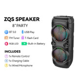 اسپیکر قابل حمل ZQS 8229 یکی از پر فروش ترین محصولات شرکت Zqs می باشد که طراحی بسیار شیک و منحصر به فردی دارد. این دستگاه شامل دو ساب 8 اینچی است که به سبب آن صدای فوق العاده بلند را تولید می کند.این اسپیکر با طرح استوانه ای ،ظاهر بسیار شیکی دارد.طراحی شگفت انگیز این محصول آن را معروف به اسپیکر x کرده است. همچنین این اسپیکر امکانات بلوتوث، فلش، مموری، رادیو ، رقص نور و ... را دارد که رقص نور آن با توجه به سلیقه ی شما قابل تغییر است . از این اسپیکر می توانید همراه با پاور بانک (۲۴ الی ۴۸ ساعت) استفاده کنید و نگران تمام شدن شارژ آن نباشید.بهمراه این اسپیکر یک عدد میکروفون بیسیم عرضه شده است.