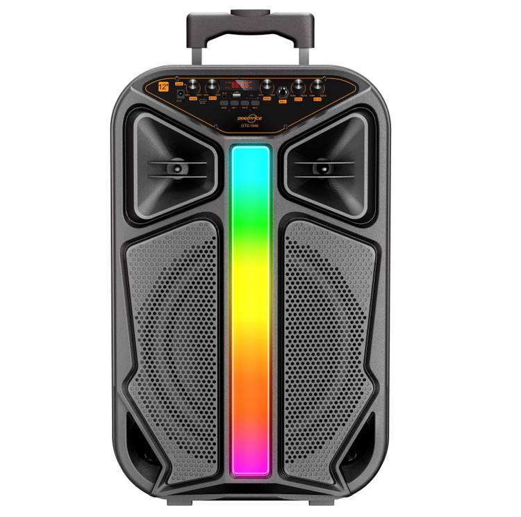 اسپیکر قابل حمل gts 1846 یک اسپیکر پرتابل ولی با صدایی فوق العاده بلند و با کیفیت است که دارای یک ساب 12 اینچی و یک تیوتر 1 اینچی می باشد که می تواند صدایی با قدرت 3500 وات پمپو را تولید کند.این اسپیکر از بلوتوث ورژن 5 پشتیبانی کرده و دارای درگاه فلش ، مموری و ای یو ایکس می باشد.این اسپیکر دارای پارتی لایت اکلایزری بسیار زیبا و حساس به صدا است که می توانید آن را به چند حالت مختلف تغییر دهید همچنین بر روی پنل پشتی این اسپیکر ولوم های تنظیم کننده کامل تعبیه شده که توسط انها قادر به تنظیم صدای اسپیکر و میکروفن خواهید بود.داخل باکس این اسپیکر یک عدد میکروفن با سیم قرار دارد که می توانید توسط آن لحظات مفرحی رو به خوانندگی و شنیدن موسیقی بپردازید.