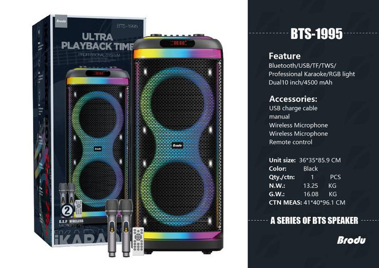 BTS1995یک بلندگوی حرفه ای کارائوکه است که خروجی صدای قدرتمند و جلوه های نورپردازی سرگرم کننده را ارائه می دهد. مجهز به 2 بلندگوی 10 اینچی و 2 ساب ووفر 10 اینچی. این کار صدای بلند و واضحی را ارائه می دهد. چراغ های LED اسپیکر را می توان با توجه به ریتم موسیقی یا ترجیحات شما روشن کرد. ویژگی های محصول: توان خروجی 150وات rms2 بلندگو 10 اینچی ساب ووفر 2*10 اینچی اتصال بلوتوث پورت USBاسپیکر برودو یکی از محصولات محبوب در دسته اسپیکرهای بلوتوث قابل حمل است. این اسپیکر به دلیل کیفیت صدای خوب و قابلیت حمل آسان مورد توجه خریداران قرار گرفته است. برخی از ویژگیهای کلیدی این اسپیکر عبارتند از: