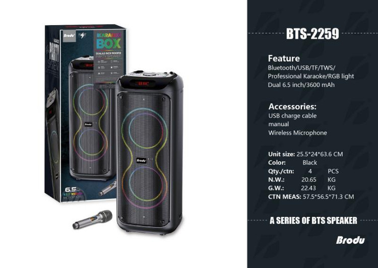 اسپیکر BTS 2259 یک اسپیکر جمع و جور ولی با صدای فوق العاده بلند و با کیفیت است که می تواند صدایی با قدرت ۴۵۰۰ را تولید کند.